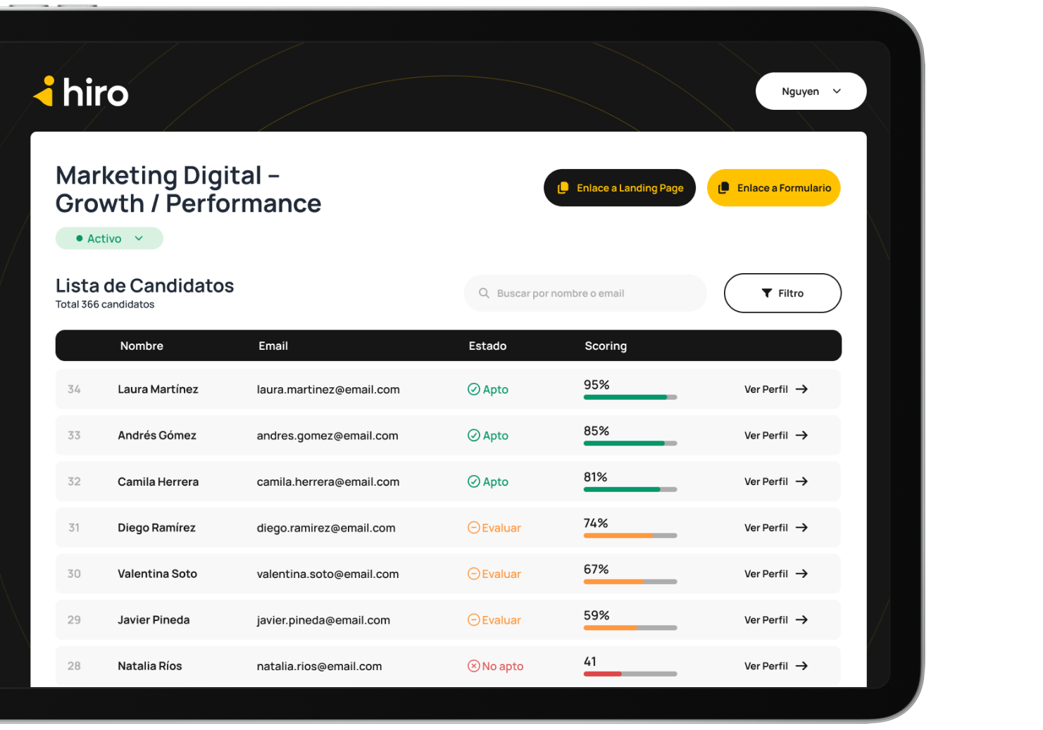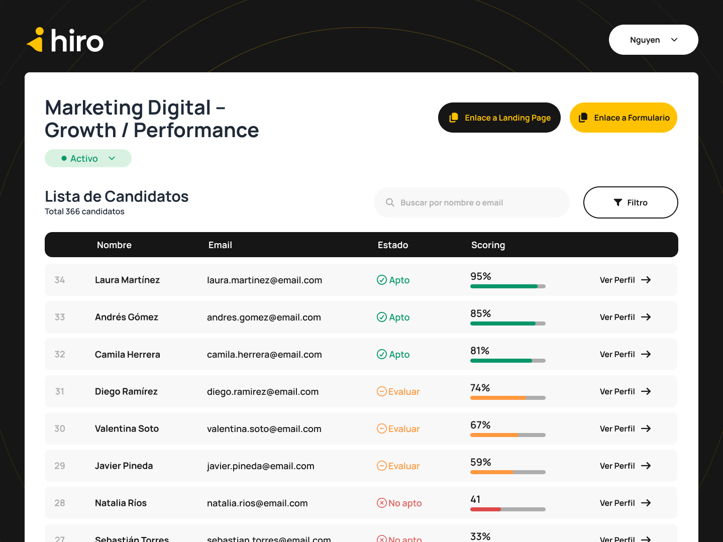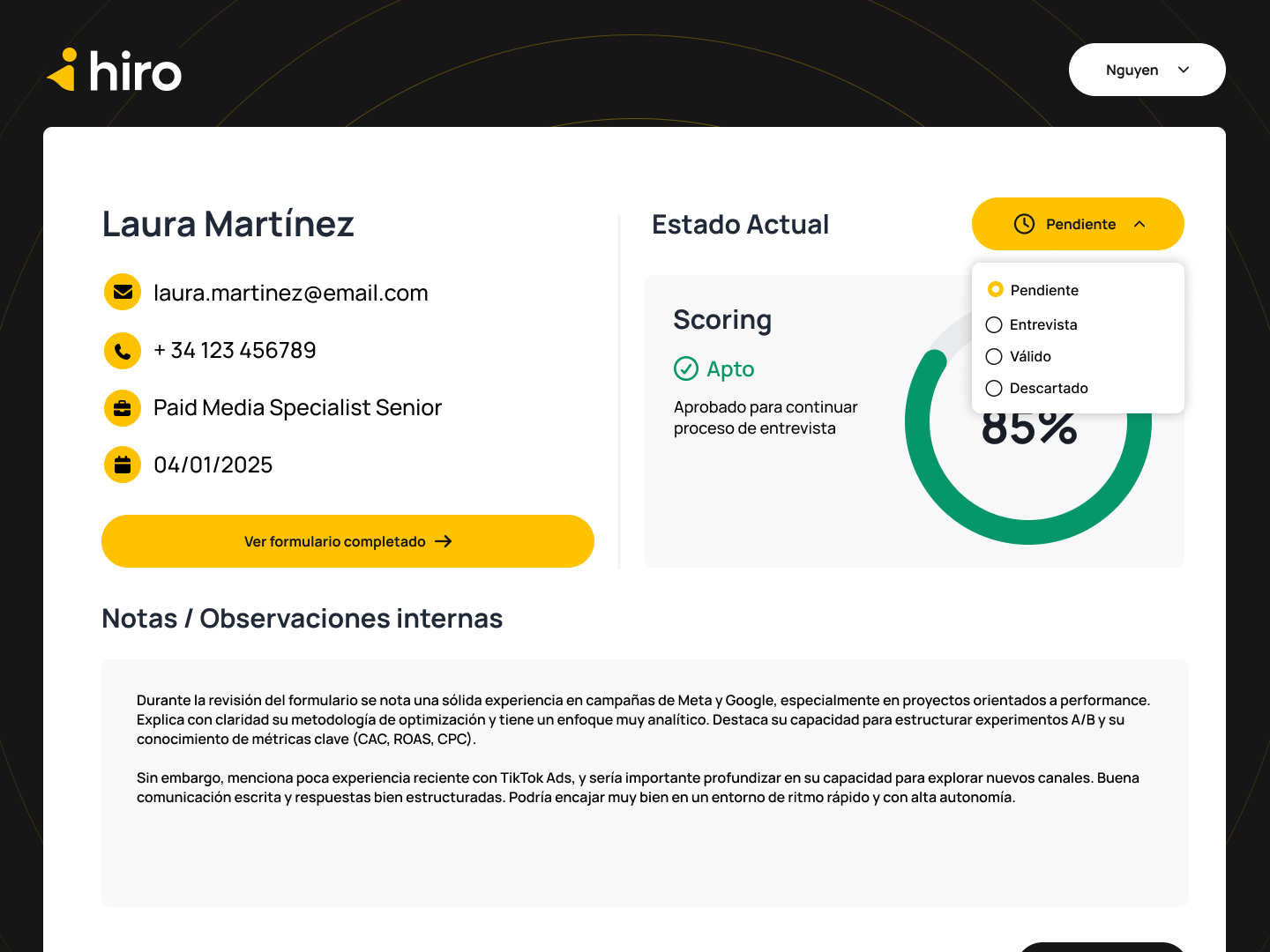 Hiro te ordena los candidatos en una lista ponderada según el encaje con la vacante y con tu empresa para que puedas evaluar los perfiles y priorizar con quien merece la pena entrevistarte y por qué.