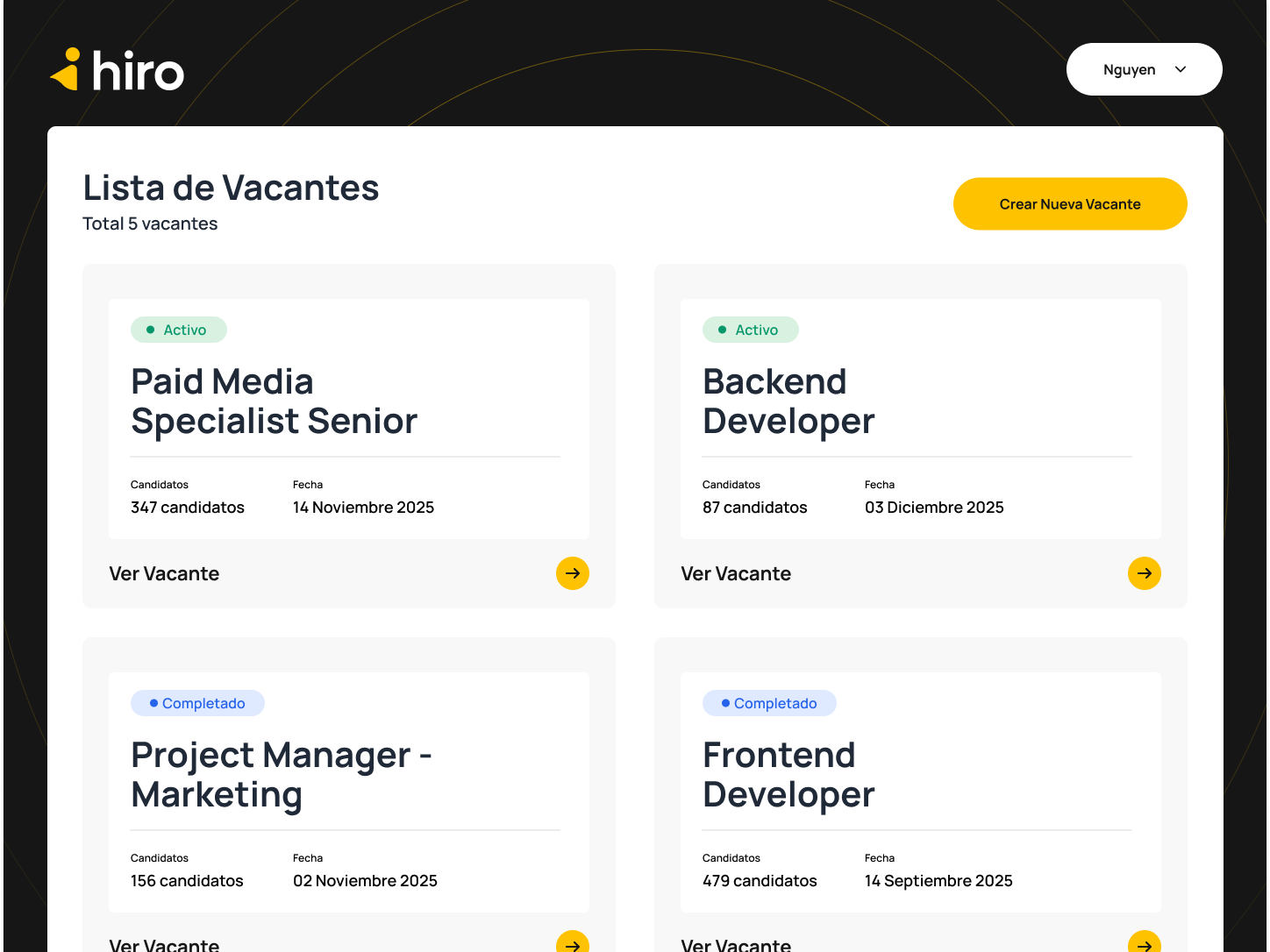 Hiro es el software de selección de talento con IA que convierte tus vacantes en páginas web profesionales, filtra candidatos con formularios inteligentes, los evalúa por WhatsApp 24/7 y te entrega un ranking listo para decidir.