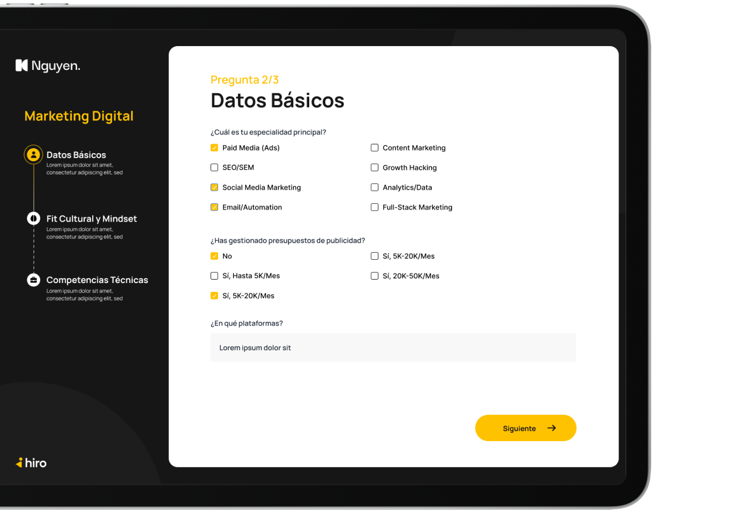 Hiro estandariza tu proceso con formularios estructurados creados con IA siguiendo un método profesional de selección que busca evaluar de manera adecuada aspectos más allá de las competencias técnicas.